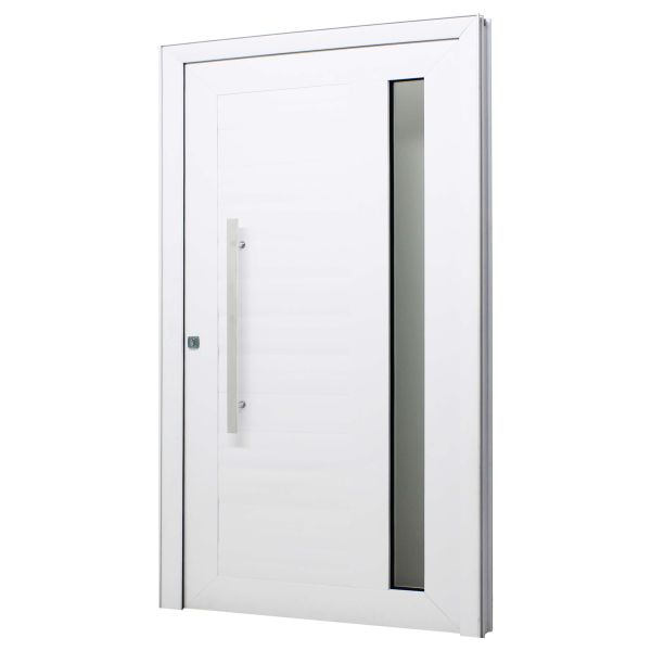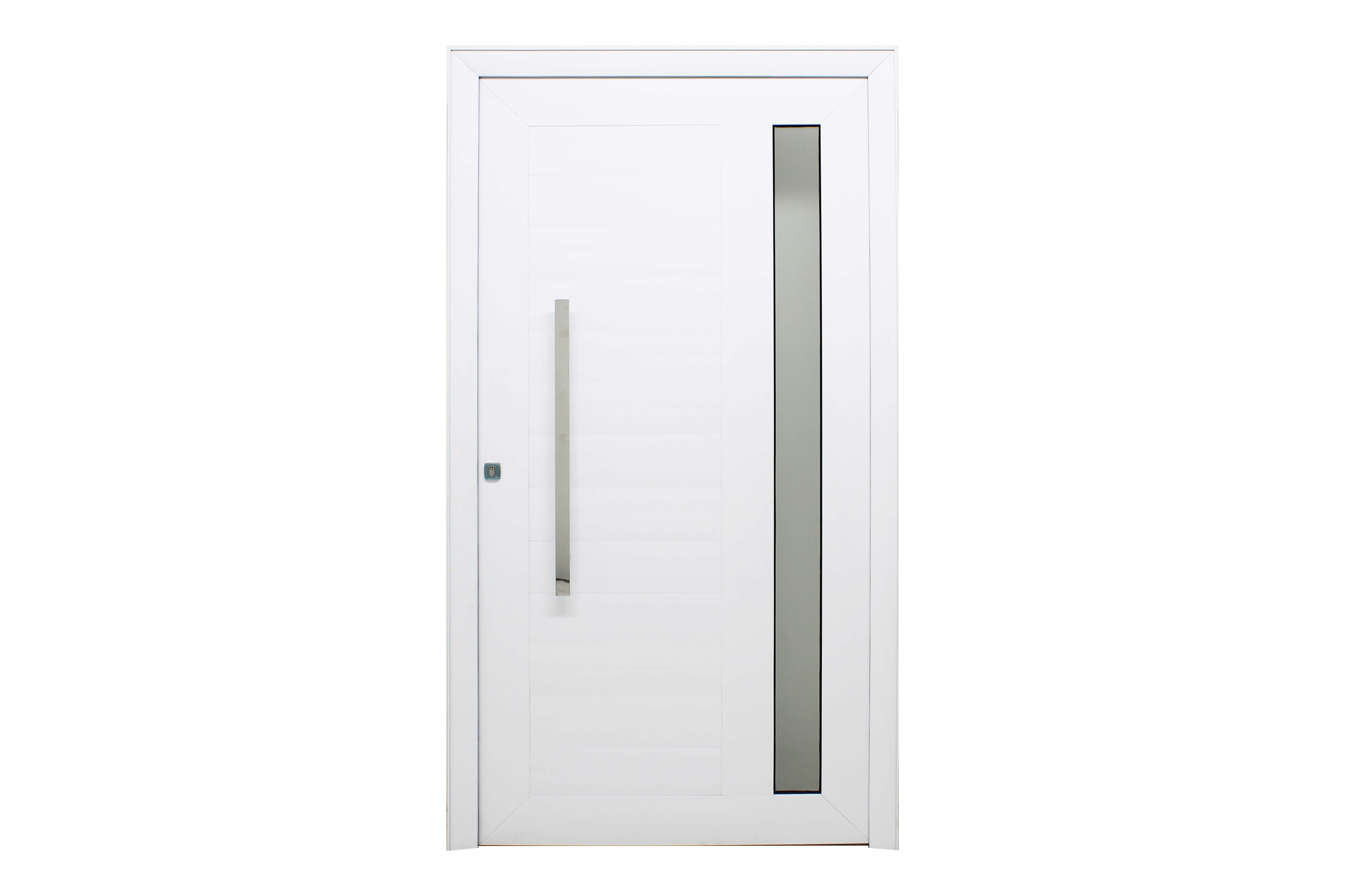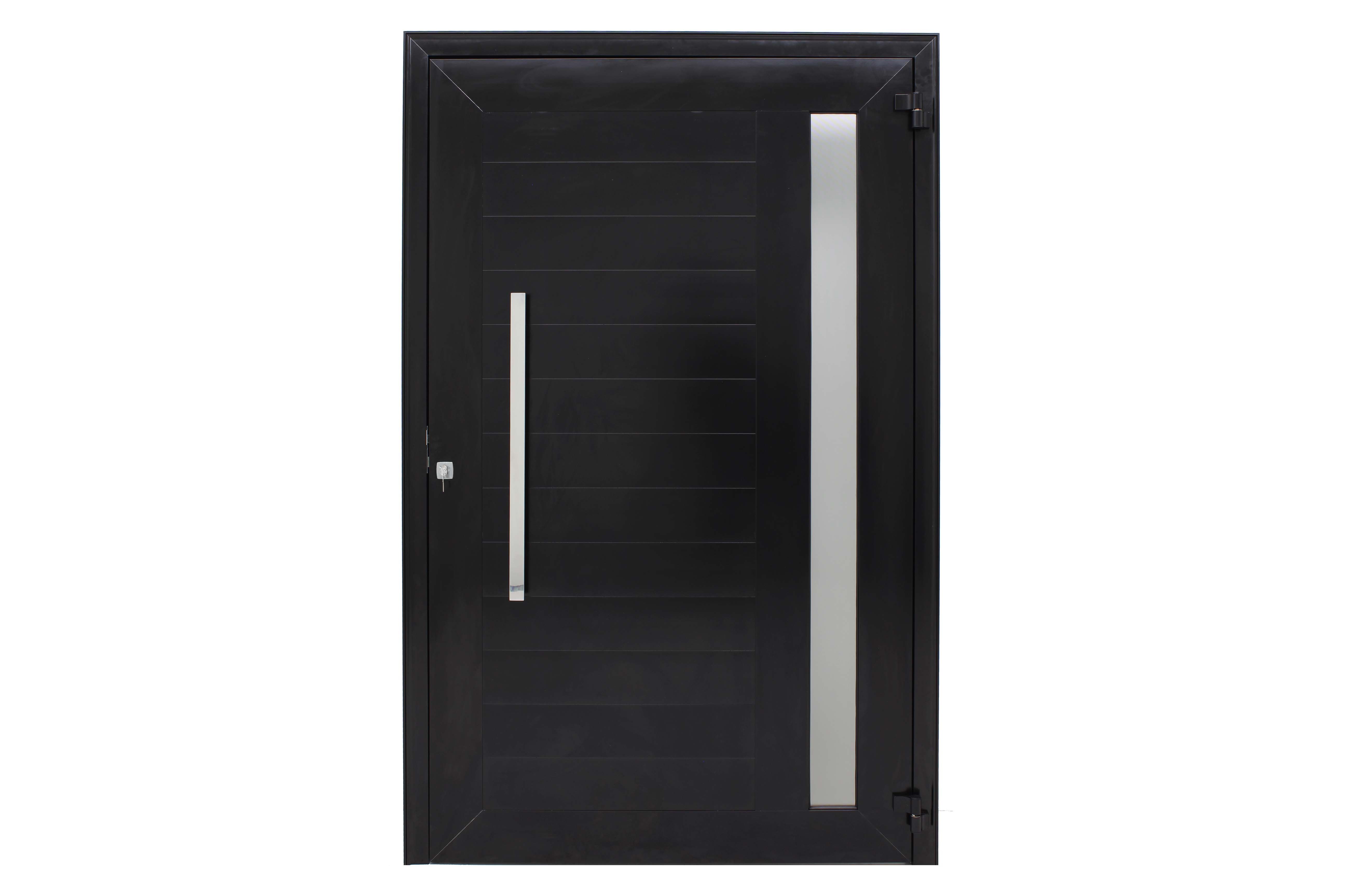 A porta de giro PSE da linha Fascino possui um acabamento em travessas horizontais, um exclusivo puxador com fechadura rolete e um visor lateral com vidro mini-boreal. Ela é uma ótima recomendação para entradas, por terem um design mais inovador e arrojado, e que ainda permite a entrada de luz.